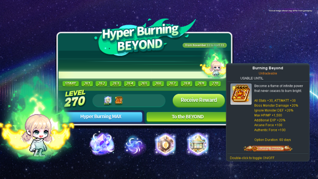 Level up to further and BEYOND! Enjoy 1+1 level ups from level 260 to level 270! Hyper Burning BEYOND can be designated twice.