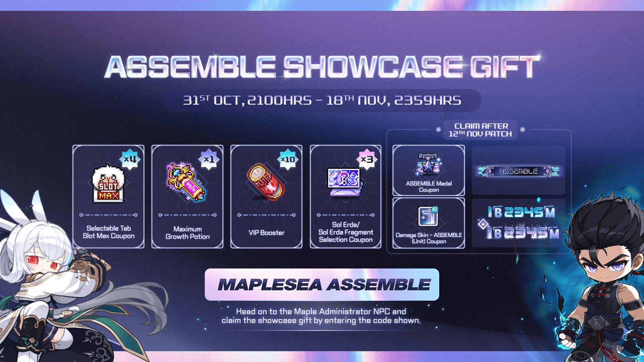 To receive the ASSEMBLE Showcase Gift, look for NPC Maple Administrator located in major towns and enter "MAPLESEA ASSEMBLE" code!