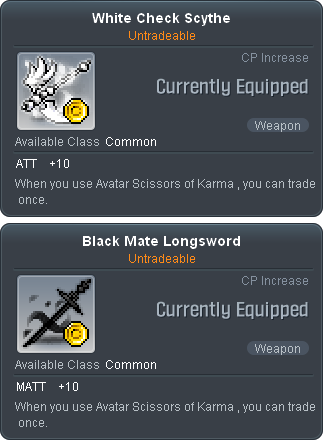 White Check Scythe and Black Mate Longsword can be upgraded using a Special Weapon Enhancement Scroll (ATT/MATT) obtainable from the Golden Apple to gain an item effect of ATT +10 or MATT +10.