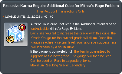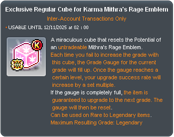 ➢ Exclusive Regular Cube for Karma Mithra's Rage Emblem and Exclusive Karma Regular Additional Cube Mithra's Rage Emblem can only be used on the Mithra's Rage Emblem obtained from this event.