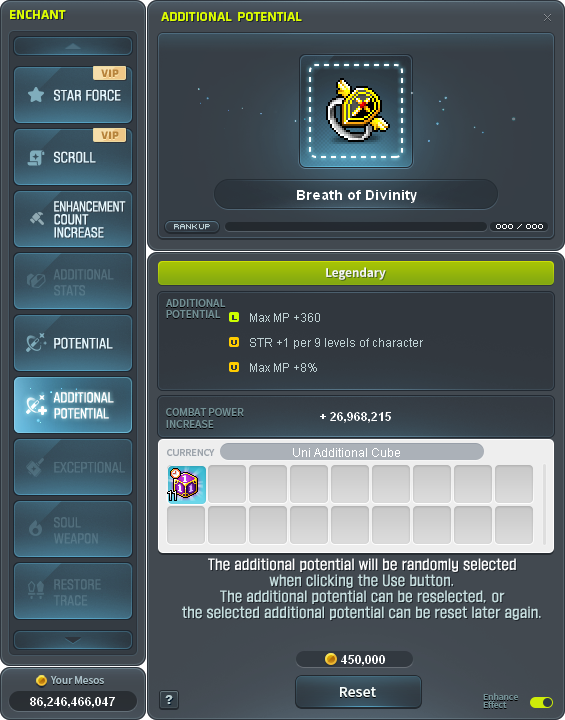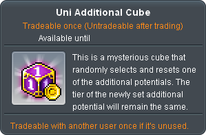 Imbued with mysterious power, the Uni Additional Cube has been discovered! This remarkable item comes with a very powerful function that resets one out of three additional potential lines in an equipment.