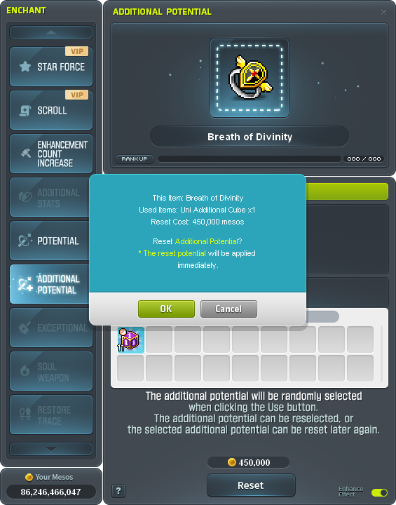 - Additional potential options that appear are determined based on the current additional potential rank of the equipment.