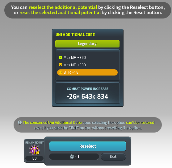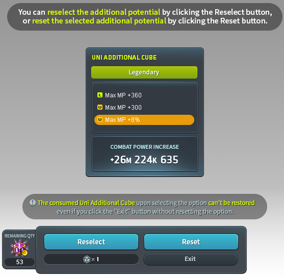 - One Uni Additional Cube will be consumed upon selecting the "Exit" function without refining the additional potential.